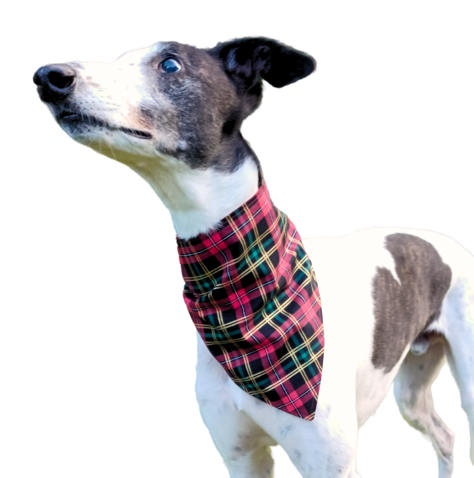 This beautiful tartan in red, green & gold scarf/bandana design is lightweight and easy to tie up around your hounds neck with two long ties. It's perfect for celebrating the holidays, or for everyday wear.